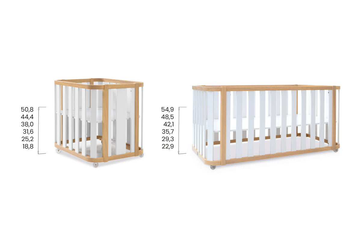 - La base del lettino si può posizionare su 6 diverse altezze: 10,8 cm - 17,2 cm - 23,6 cm - 30 cm - 36,4 cm - 42,8 cm (senza materasso); o 22,8 cm - 29,2 cm - 35,6 cm - 42 cm - 48,4 cm - 54,8 cm (con materasso)