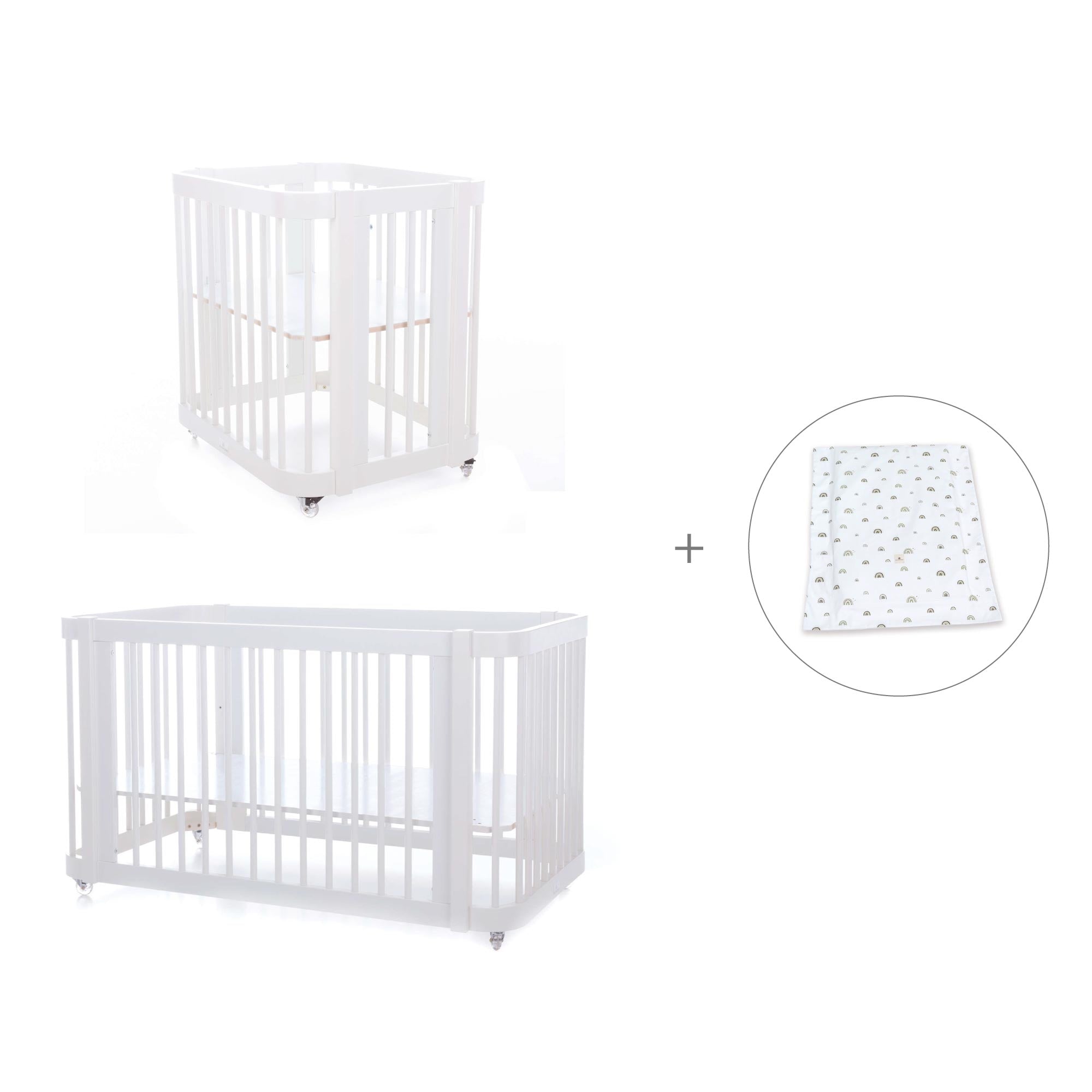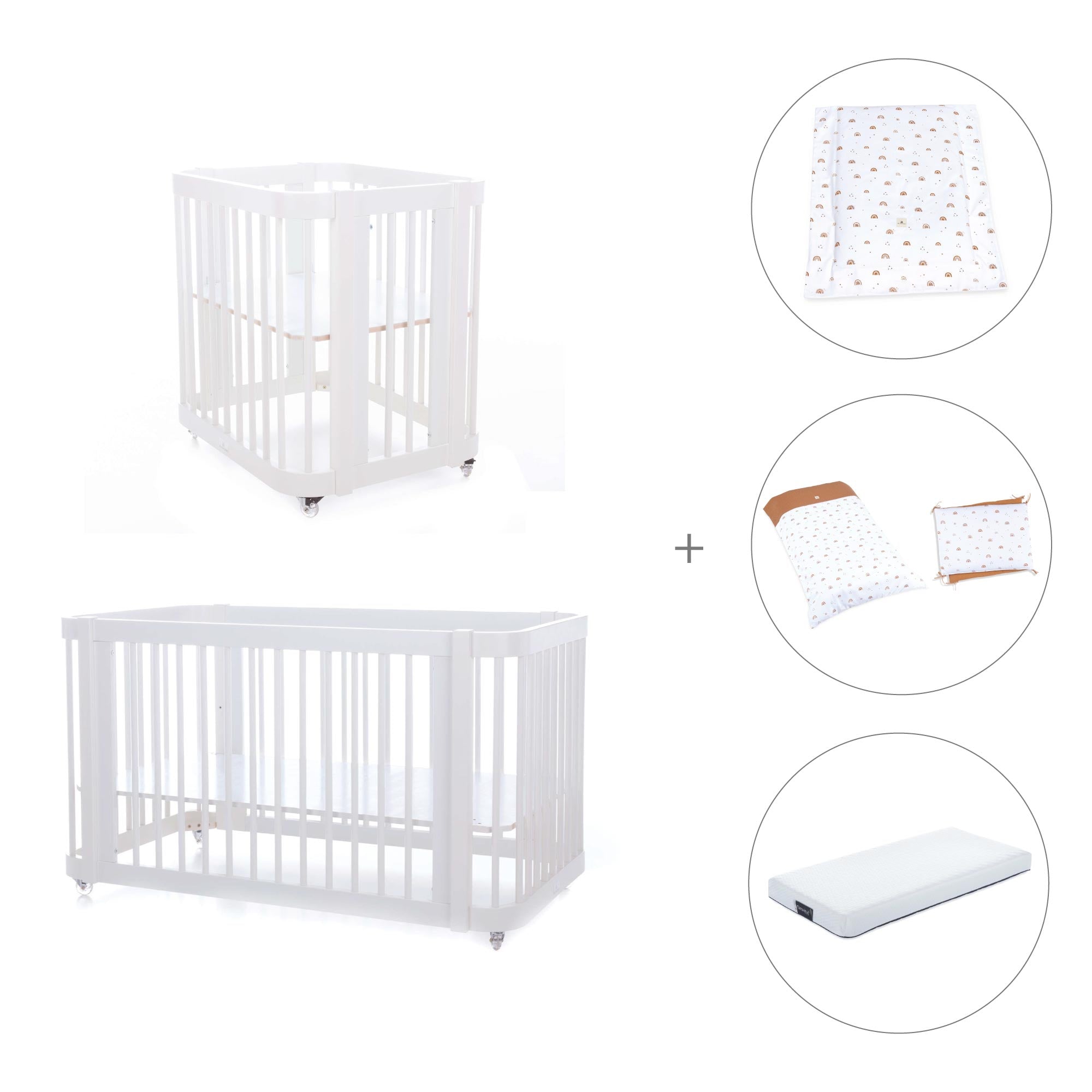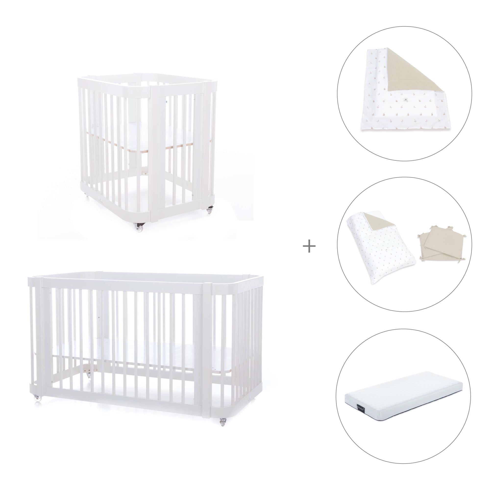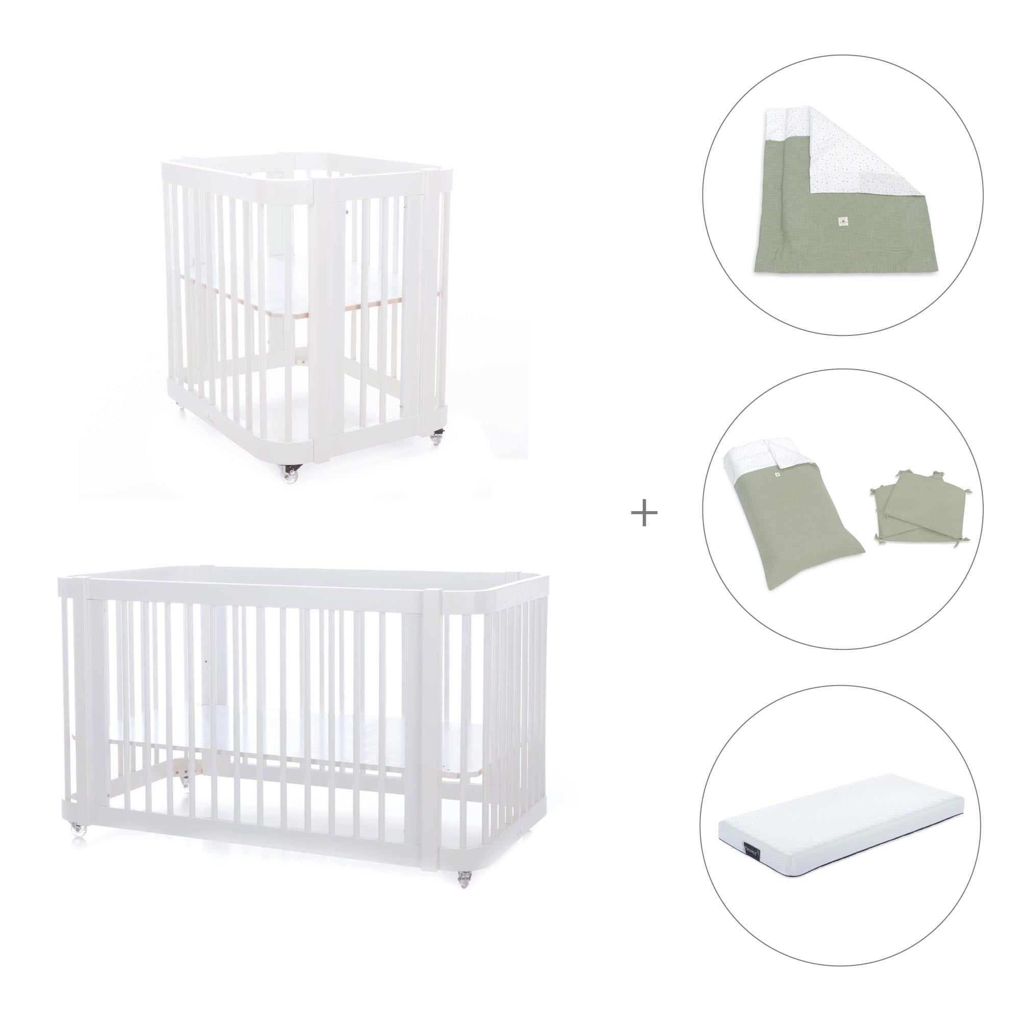 Durante i primi mesi del neonato, puoi utilizzare Crea Tre assemblata nella fase culla, semplicemente aggiungendo le due rotaie più piccole e la base della mini culla (inclusa).