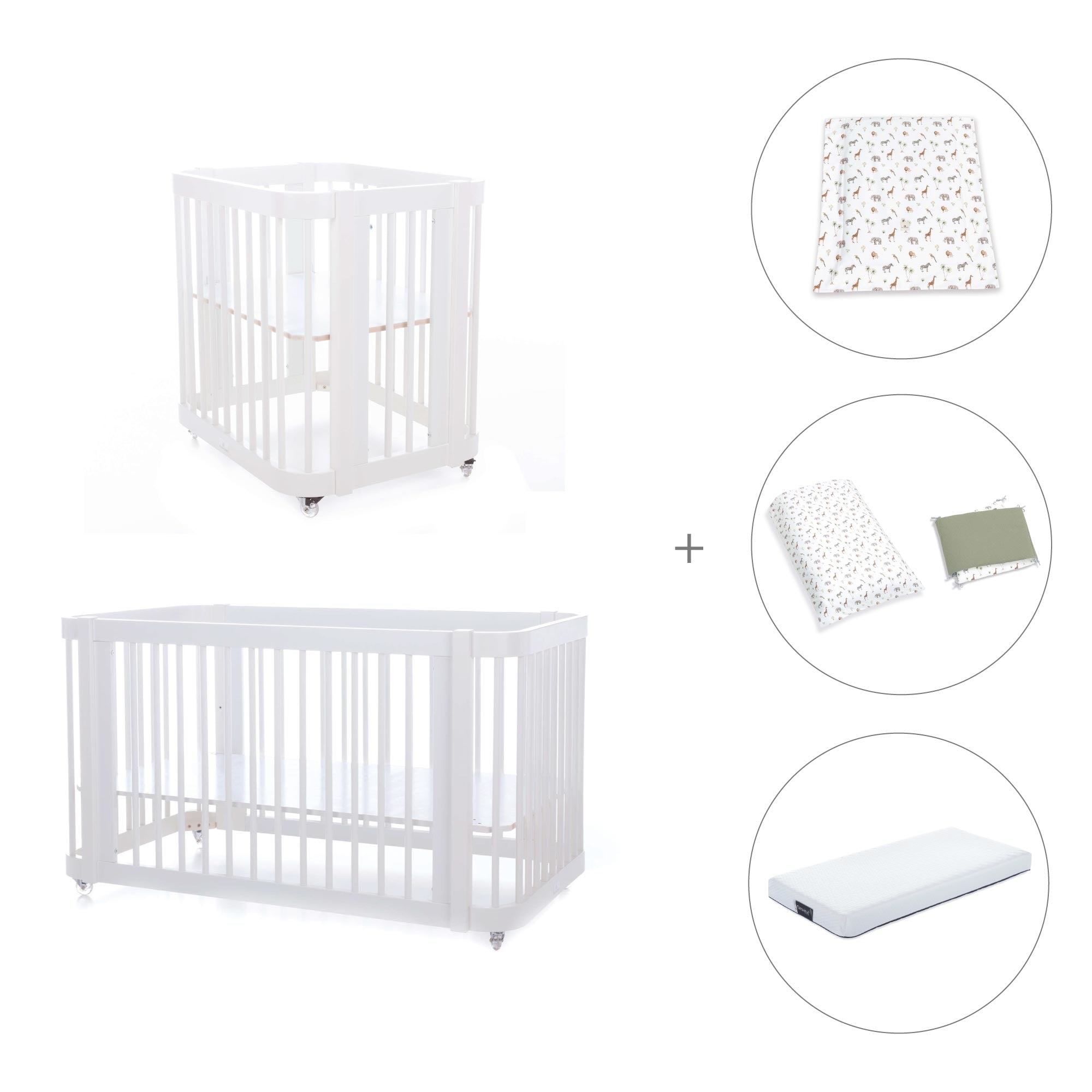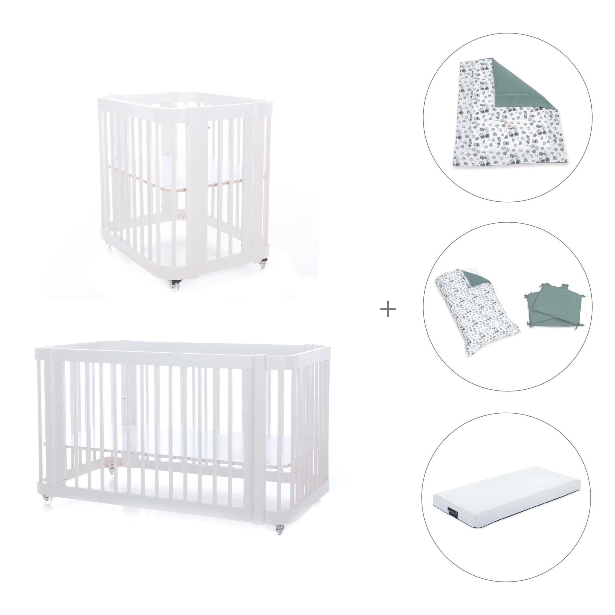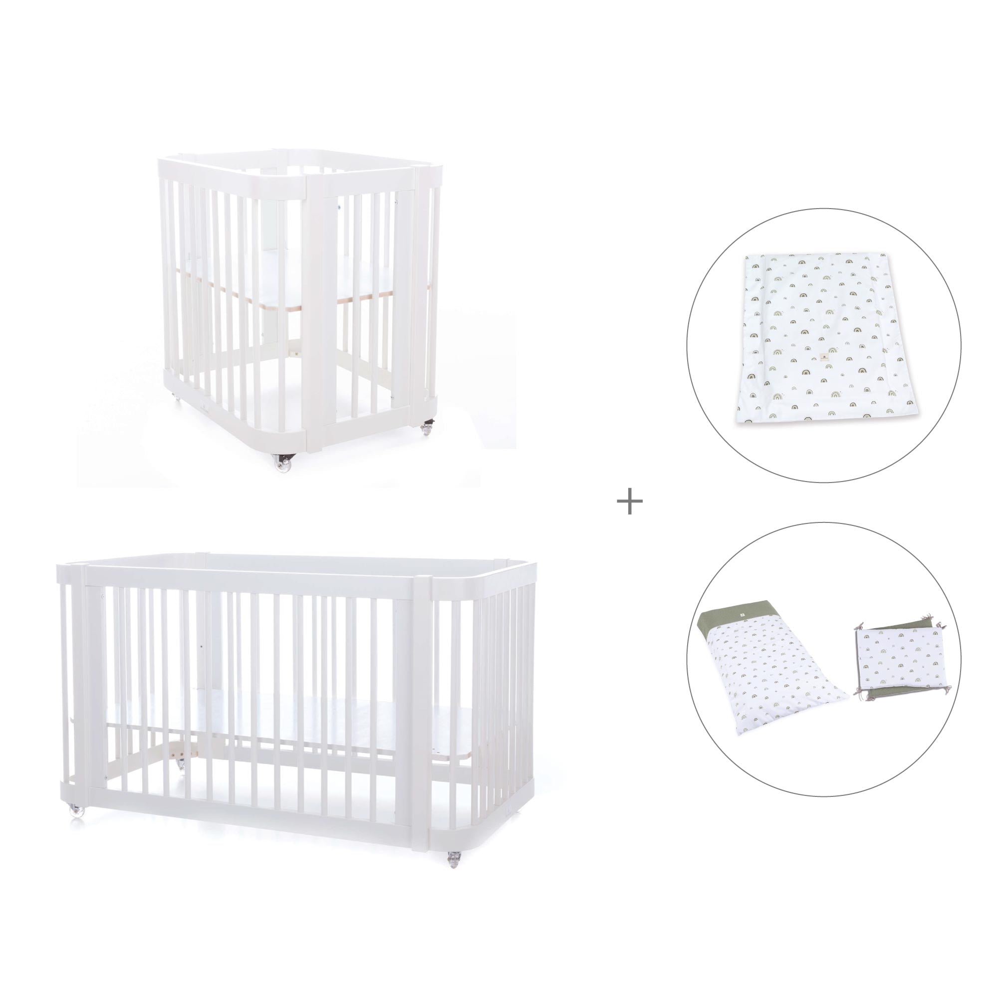 Durante i primi mesi del neonato, puoi utilizzare Crea Tre assemblata nella fase culla, semplicemente aggiungendo le due rotaie più piccole e la base della mini culla (inclusa).