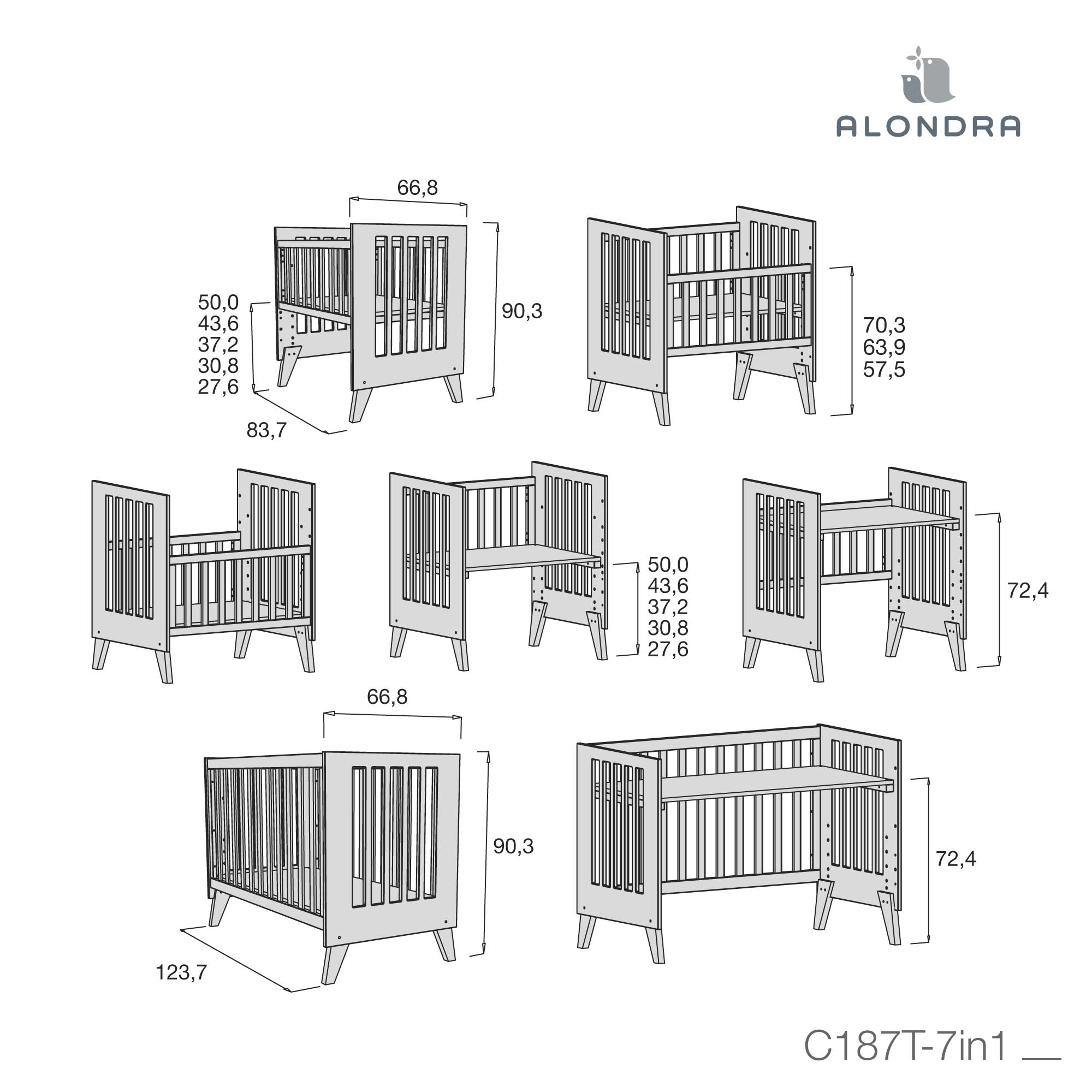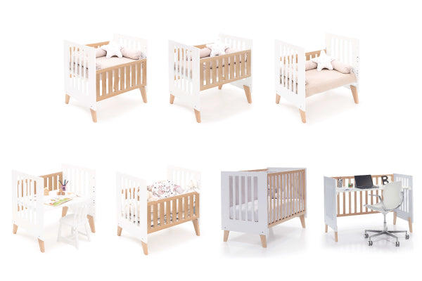 • Trasformabile in 7 fasi senza l'utilizzo di elementi aggiuntivi: Culla co-sleeping 60x80 cm - Culla 60x80 cm - Divanetto - Scrivania - Portagiochi - Lettino 60x120 cm - Scrivania per bambini 60x120 cm.