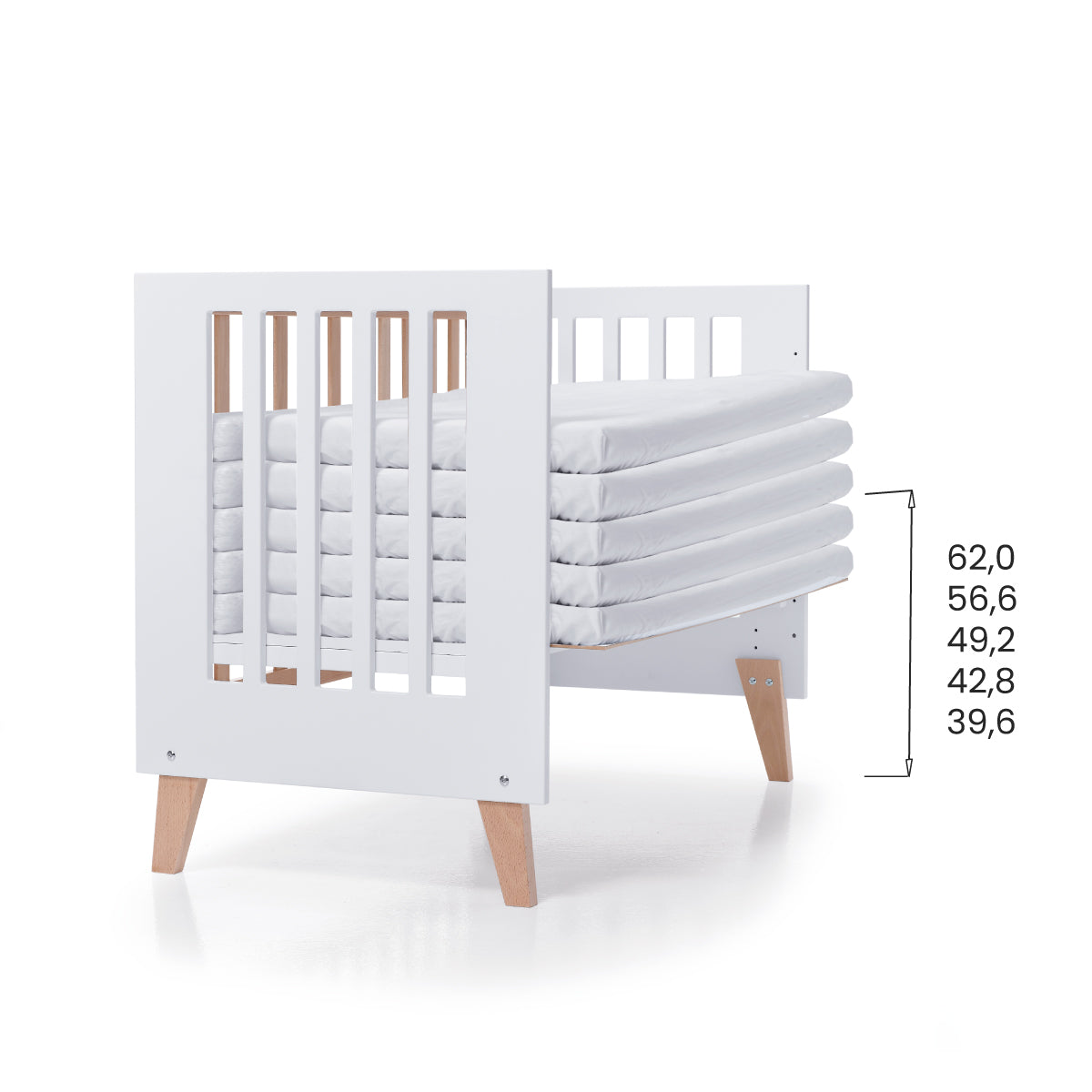 • La base del lettino si può posizionare su 5 diverse altezze (con ruote): 27,6 cm - 30,8 cm - 37,2 cm - 43,6 cm - 50 cm (senza materasso); 39,6 cm - 42,8 cm - 49,2 cm - 55,6 cm - 62 cm (con materasso).