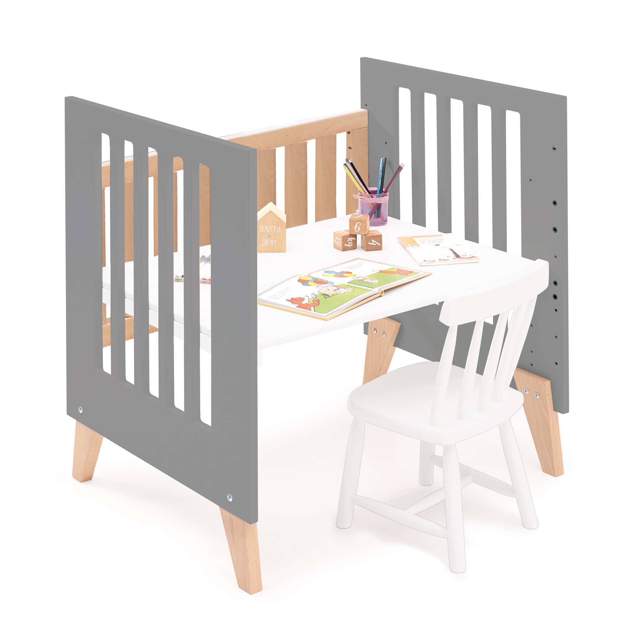 Otra opción es convertir la minicuna en un funcional pupitre de bebé. Sería en la misma posición que el sofá pero sin colchón ni textil y añadiendo una silla o taburete (no incluido).