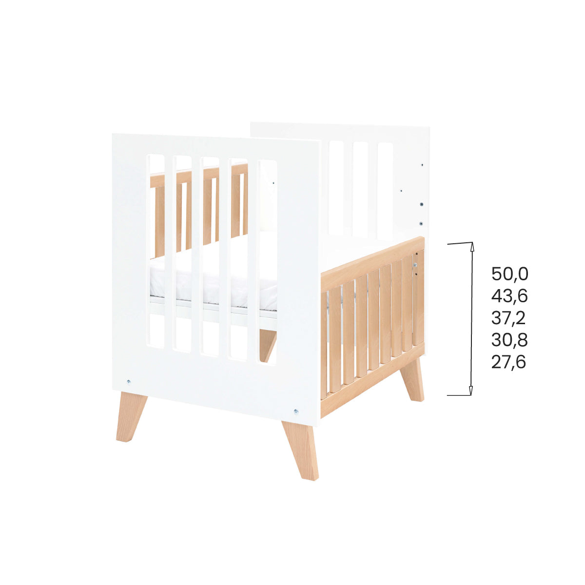 - La sponda della culla è regolabile su 3 altezze, dal materasso del letto dei genitori per la modalità co-sleeping (con ruote): 57,5 cm - 63,9 cm - 70,3 cm.