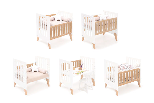 - Trasformabile in 5 fasi senza elementi aggiuntivi: Culla co-sleeping - Culla - Divanetto - Scrivania - Portagiochi.