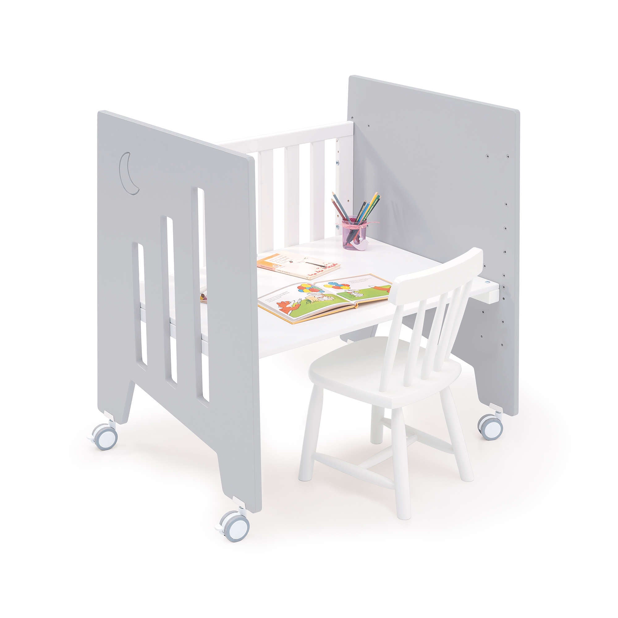 Otra opción es convertir la minicuna en un funcional pupitre de bebé. Sería en la misma posición que el sofá pero sin colchón ni textil y añadiendo una silla o taburete (no incluido).