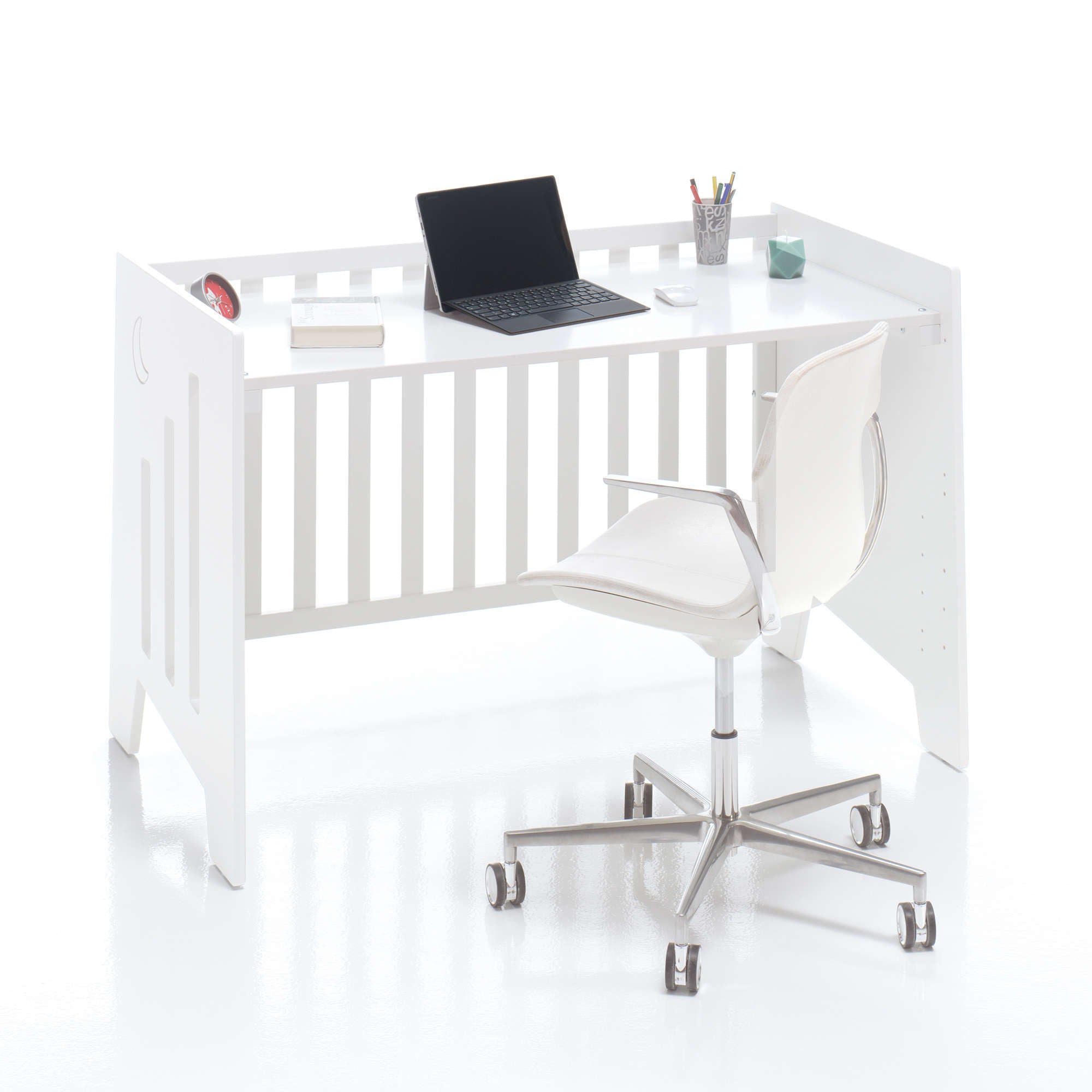 Simplemente debes quitar la barandilla lateral, subir el tablero somier a la altura más elevada y quitar las ruedas. Y, así, ya dispones de un práctico escritorio infantil que tu hijo o hija podrá usar durante mucho tiempo. ¡Es super funcional!