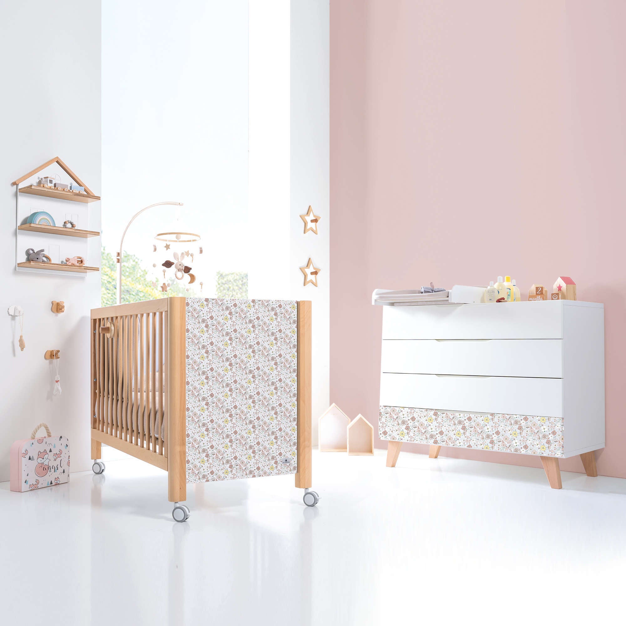 Lettino 60x120 cm legno con vinile fiori rosa sulla testata · Ombra Liberty