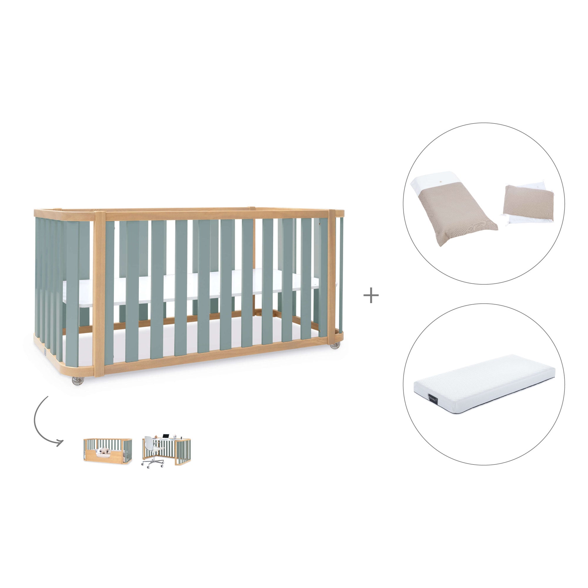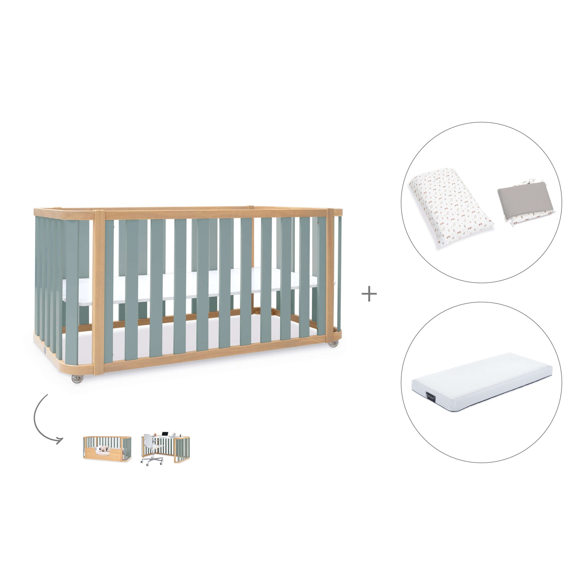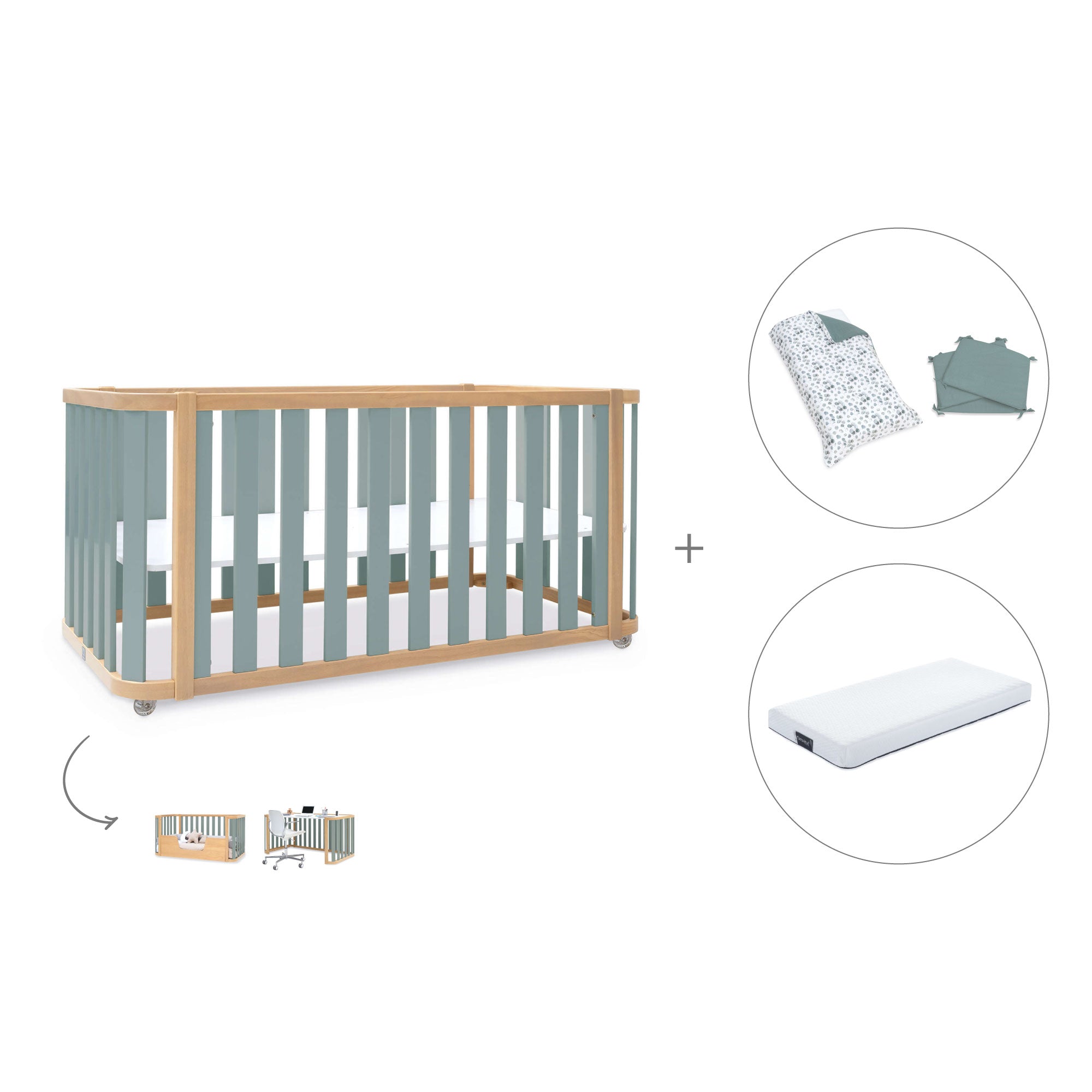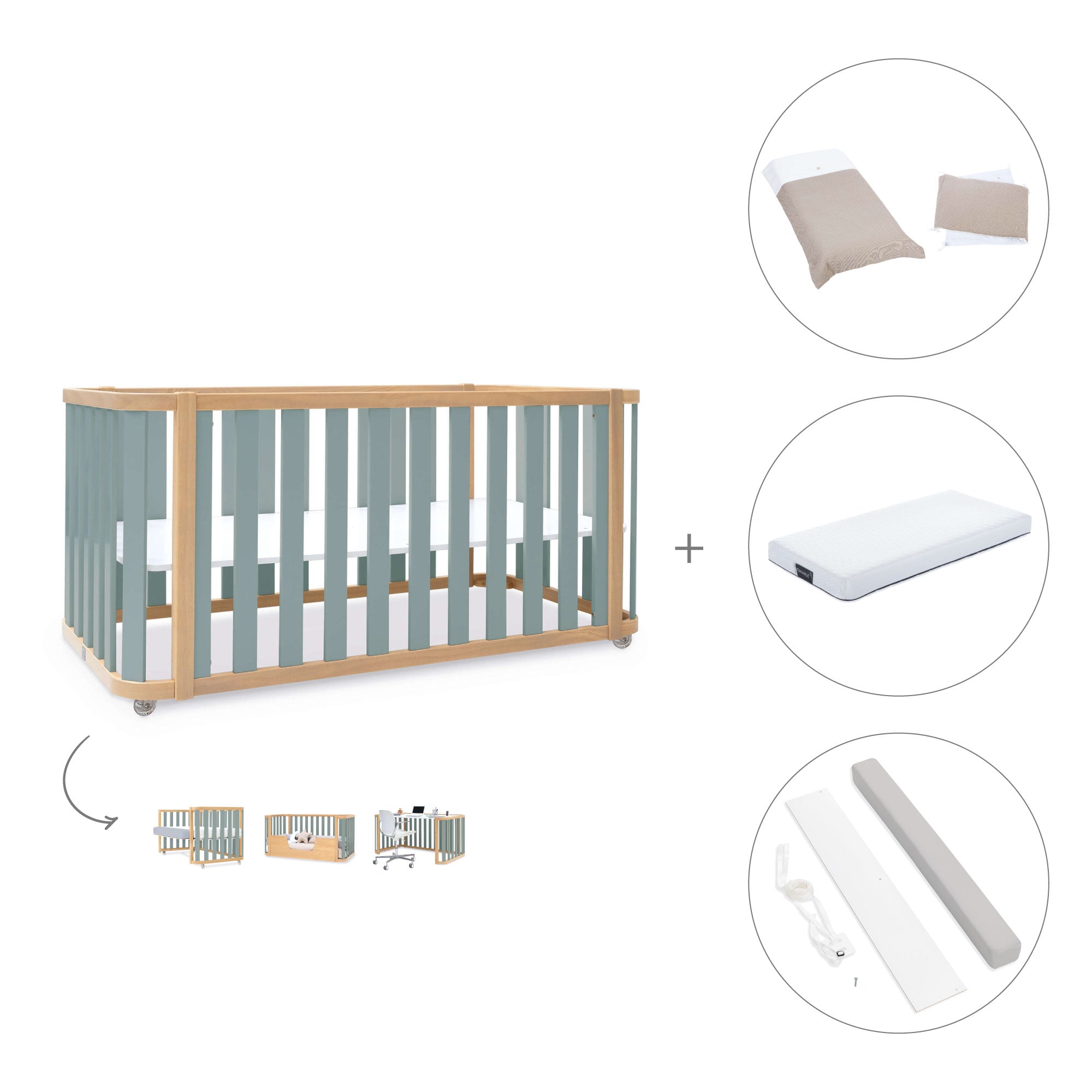 Create la stanza perfetta per il tuo bambino con questo lettino evolutivo in legno! Con un design unico, questo grande lettino Crea Plus Due Eucalyptus offre 3 fasi evolutive per adattarsi alla crescita del vostro piccolo: prima come lettino 70x140 cm, poi come lettino Montessori con sponda junior della stessa dimensione e infine come pratica scrivania, per un uso prolungato! La sua solida struttura in legno garantisce stabilità, sicurezza e comfort per il riposo del bambino. Inoltre, la combinazione di colori legno e verde eucalipto crea un'atmosfera molto naturale. Come opzione, può essere trasformato in un lettino co-sleeping acquistando il kit opzionale. Può anche essere trasformato in una culla di 55x70 cm con il kit di conversione in culla (rif. WM351).351).