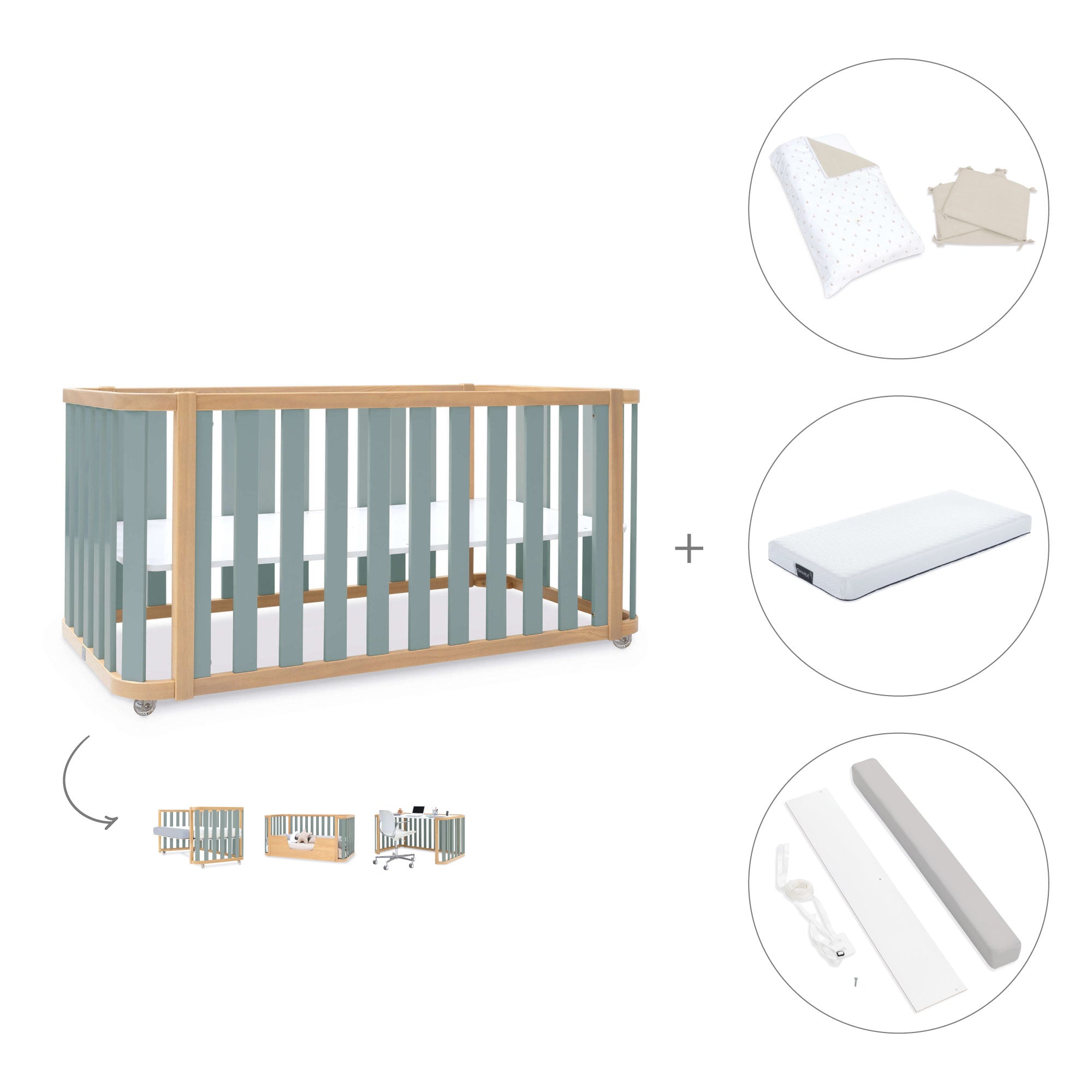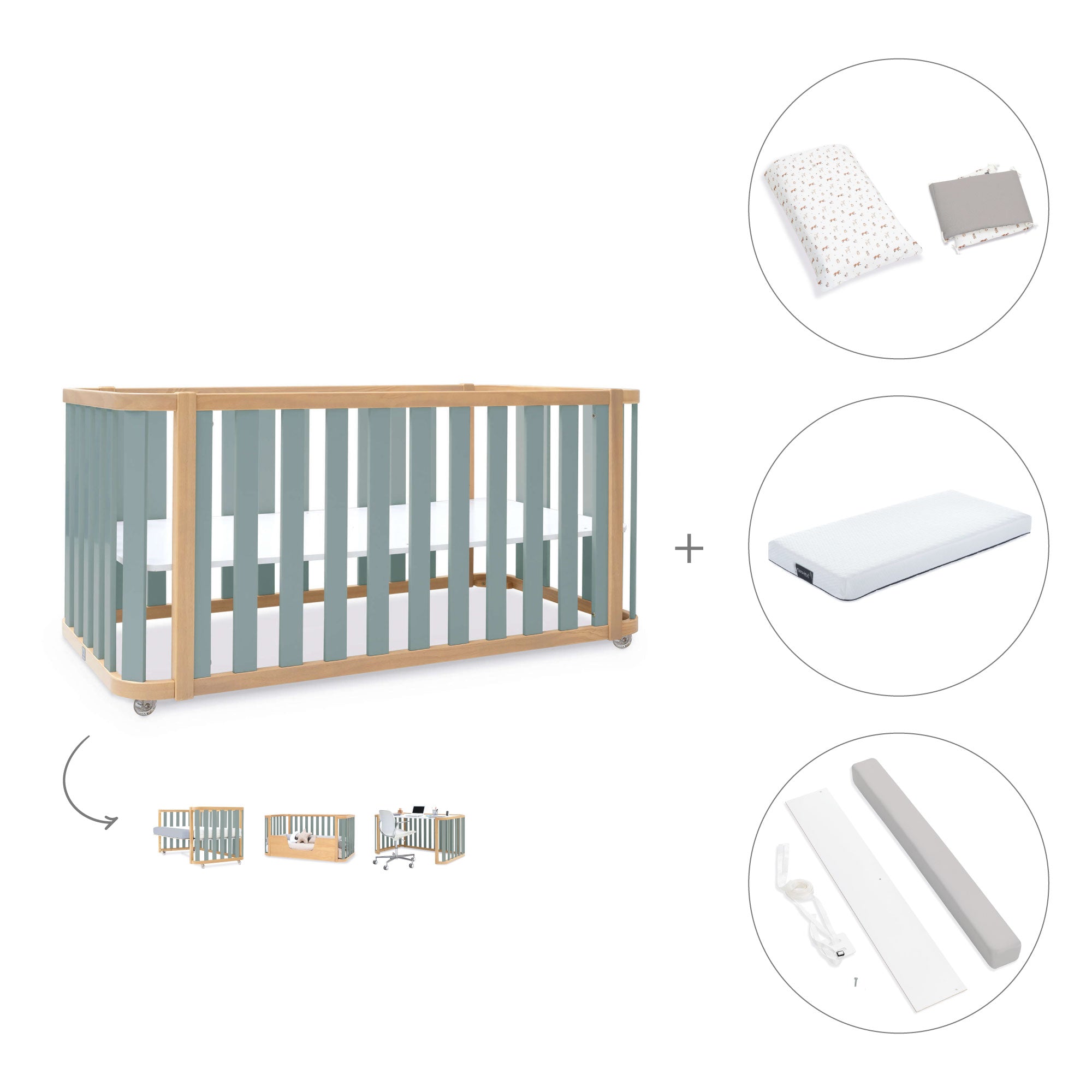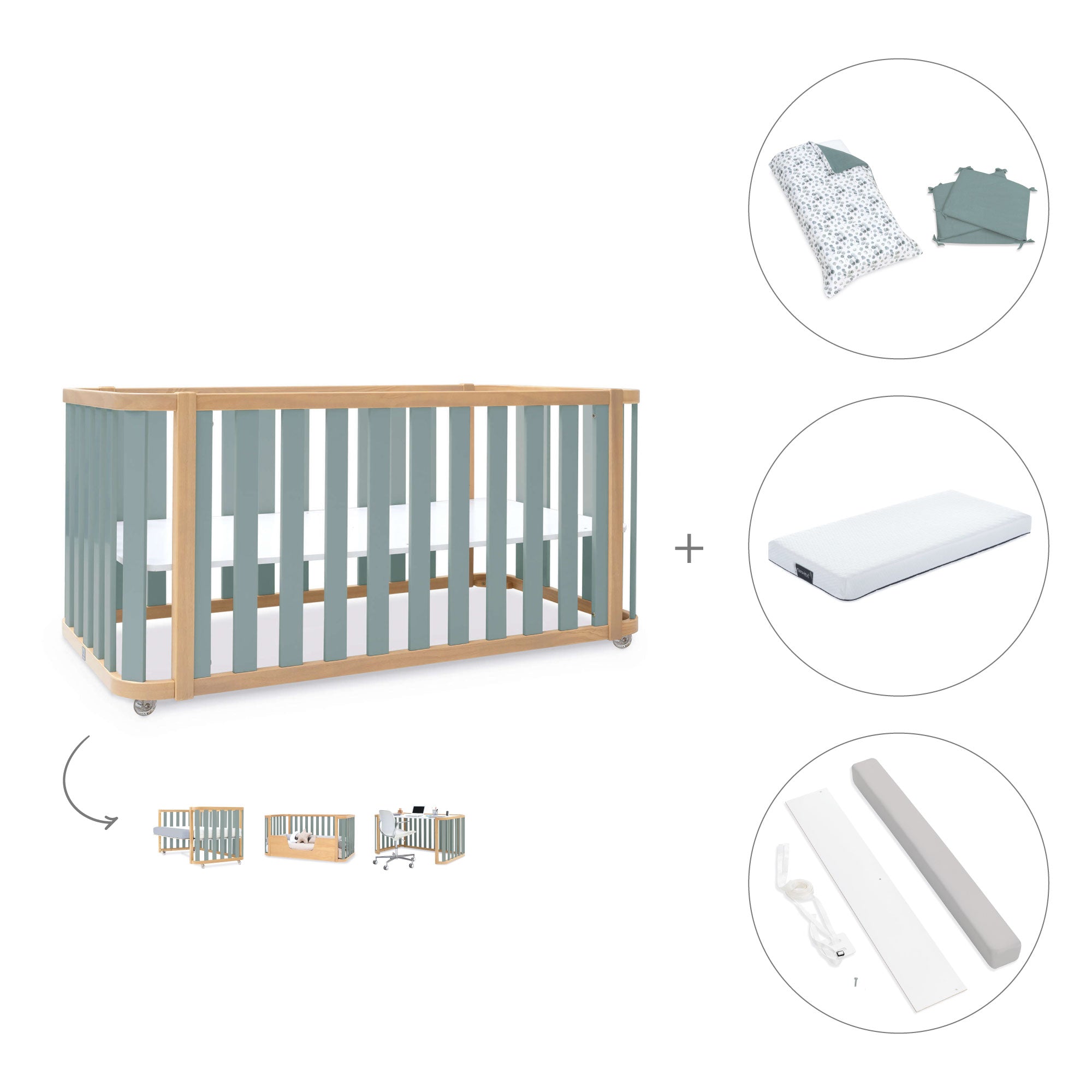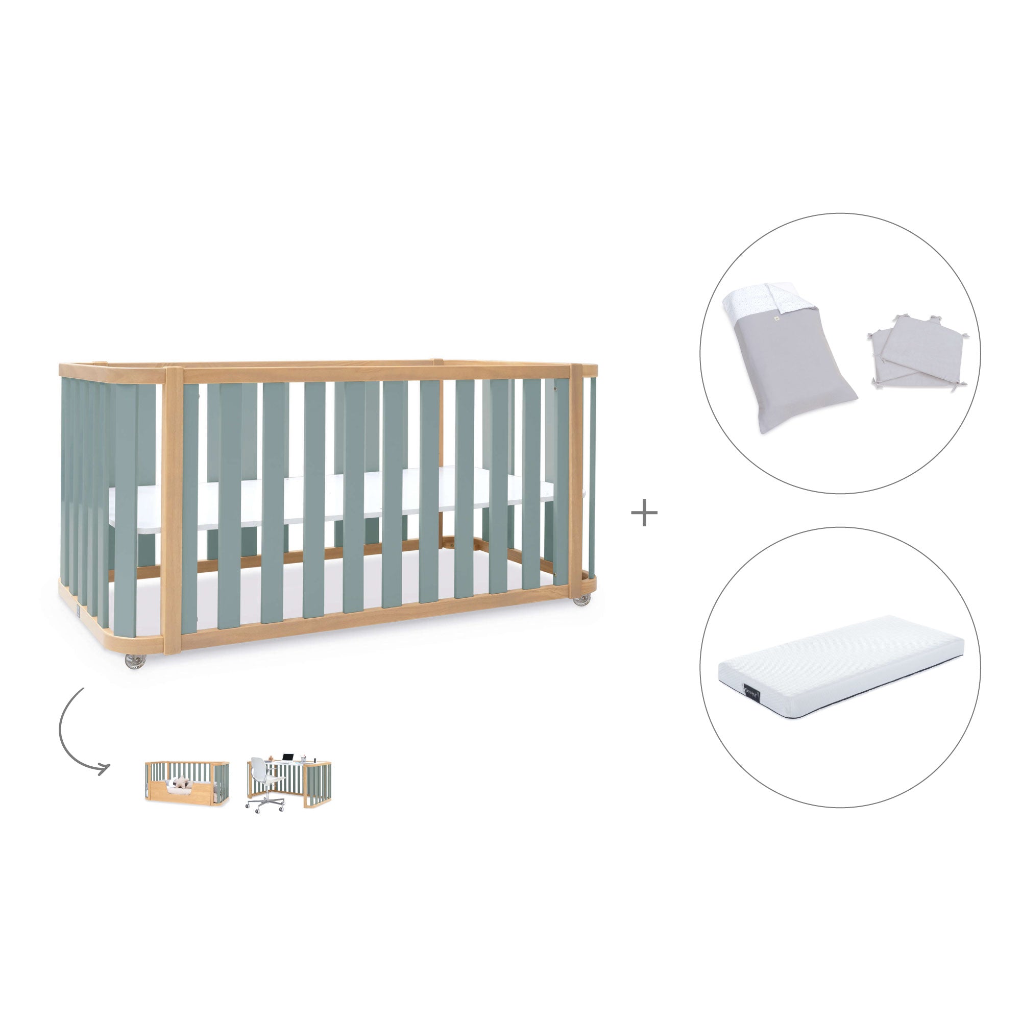 Create la stanza perfetta per il tuo bambino con questo lettino evolutivo in legno! Con un design unico, questo grande lettino Crea Plus Due Eucalyptus offre 3 fasi evolutive per adattarsi alla crescita del vostro piccolo: prima come lettino 70x140 cm, poi come lettino Montessori con sponda junior della stessa dimensione e infine come pratica scrivania, per un uso prolungato! La sua solida struttura in legno garantisce stabilità, sicurezza e comfort per il riposo del bambino. Inoltre, la combinazione di colori legno e verde eucalipto crea un'atmosfera molto naturale. Come opzione, può essere trasformato in un lettino co-sleeping acquistando il kit opzionale. Può anche essere trasformato in una culla di 55x70 cm con il kit di conversione in culla (rif. WM351).351).