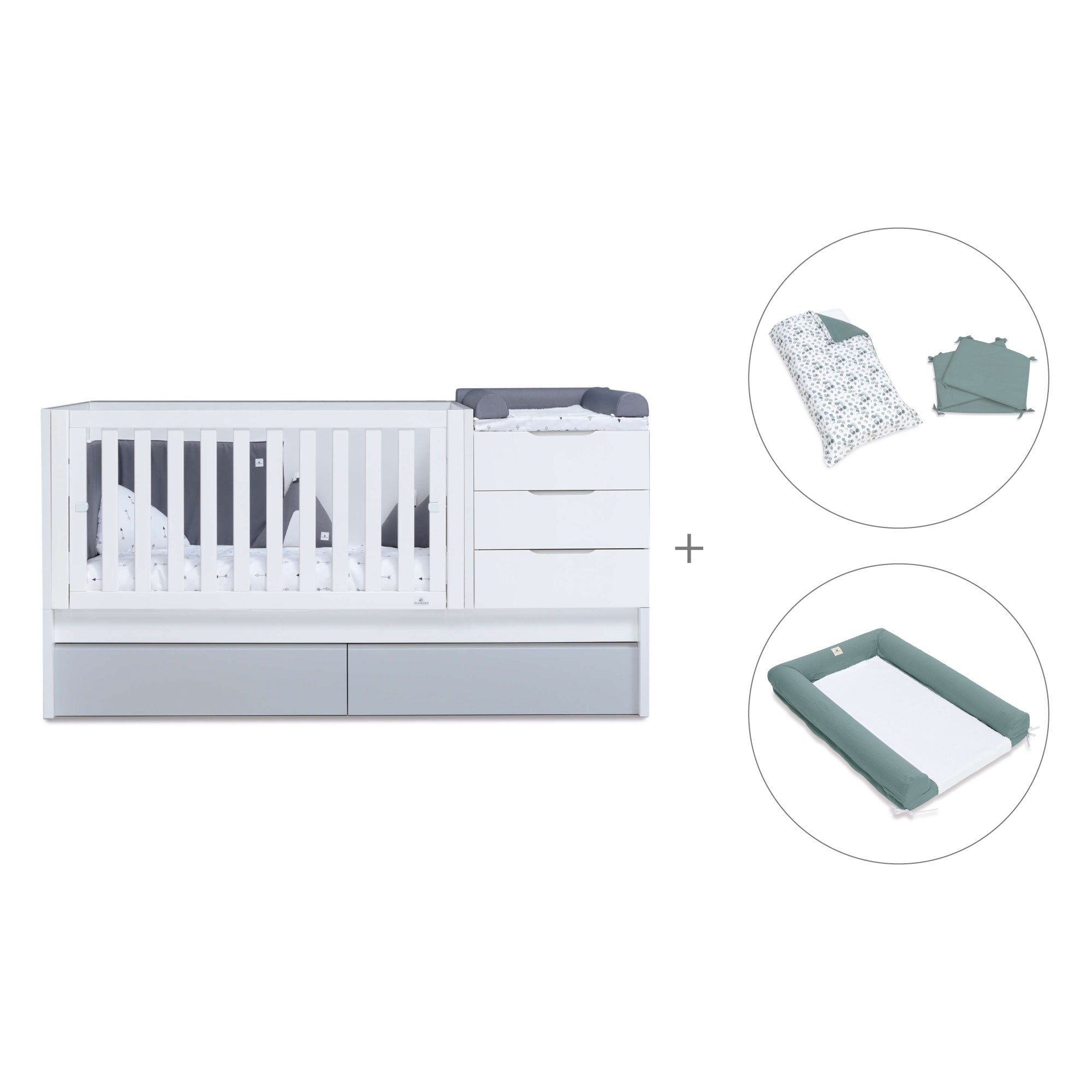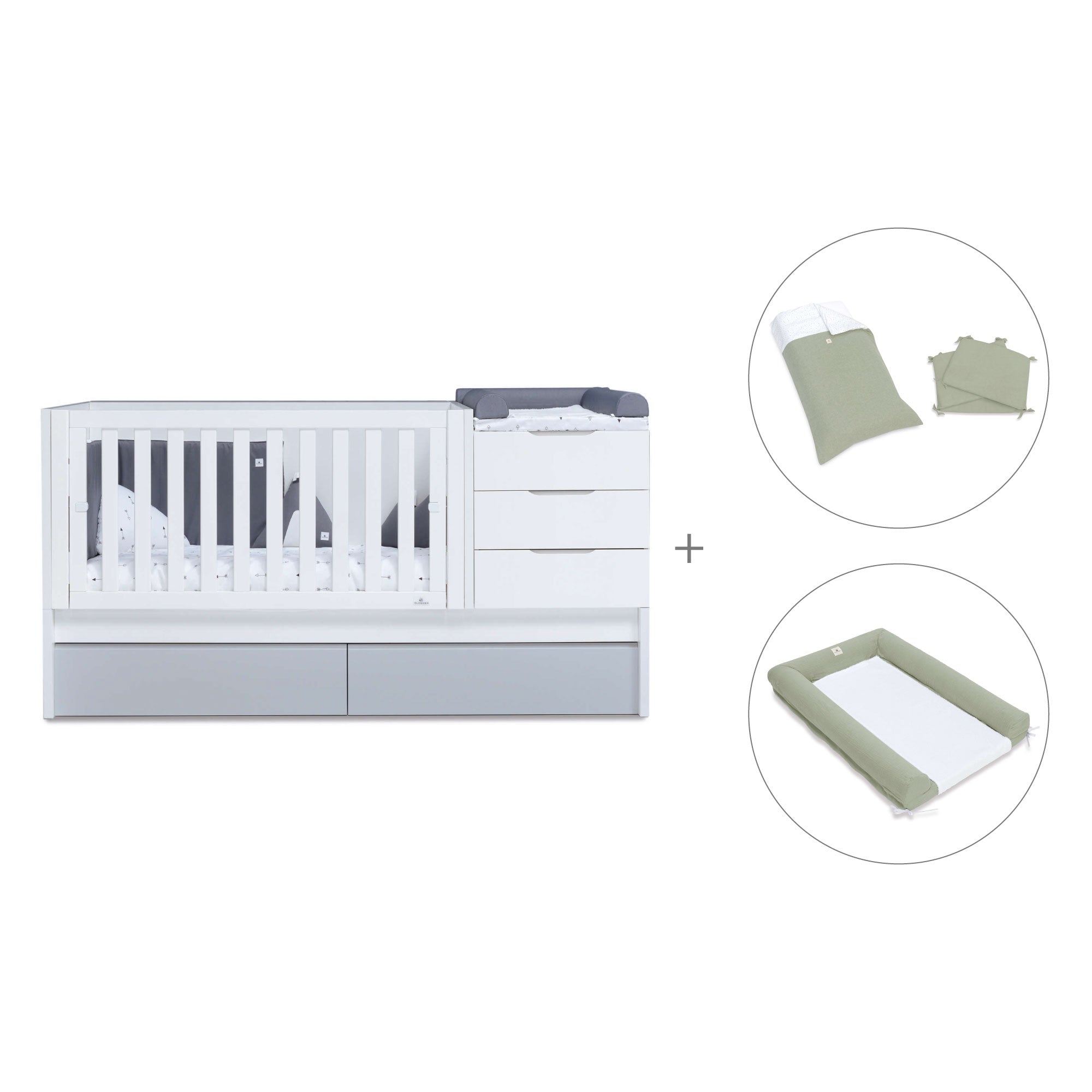 Nello stesso mobile avrete il lettino 70×140 cm, una cassettiera con 3 cassetti e na zona fasciatoio nella parte superiore, un book libreria con 2 grandi scompartimenti e nella parte inferiore, 2 cassettoni o un letto a rotelle tra cui scegliere.