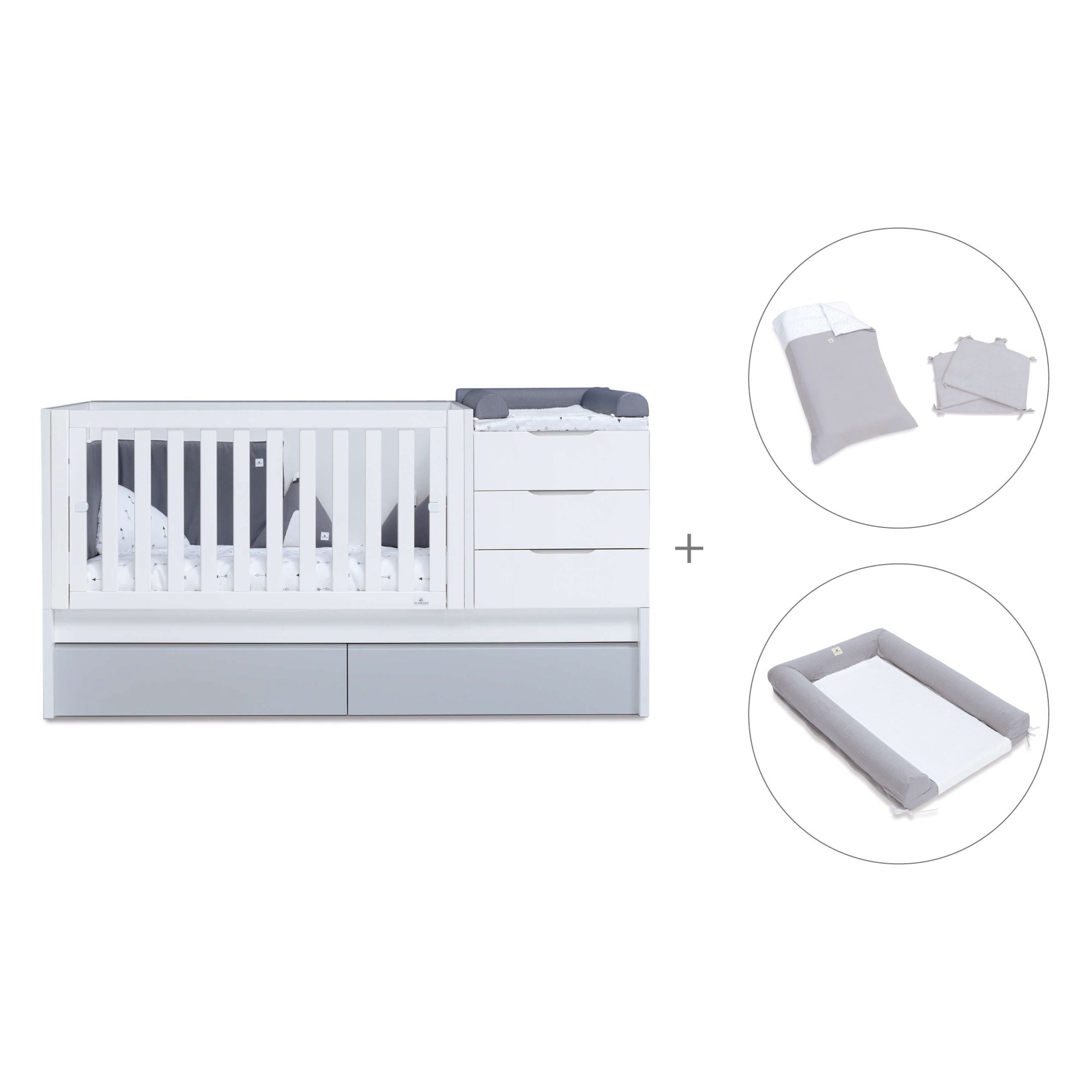 - Trasformabile in letto junior 90x200 cm (con cassetti o letto estraibile), un comodino con 3 cassetti, scrivania e book libreria (non sono necessari elementi aggiuntivi).