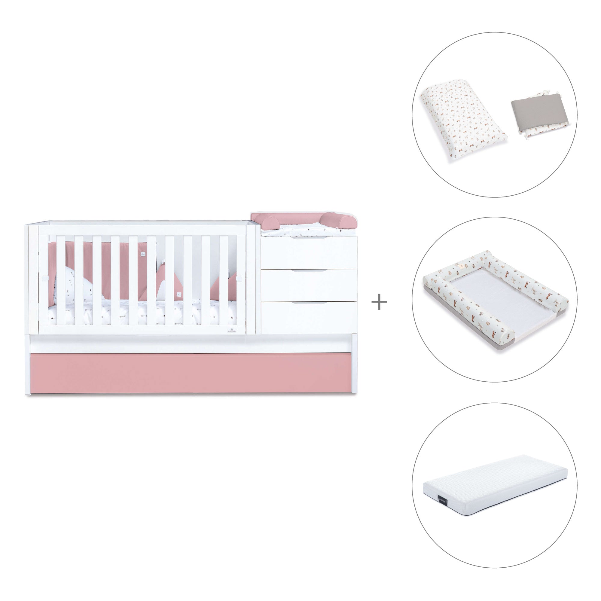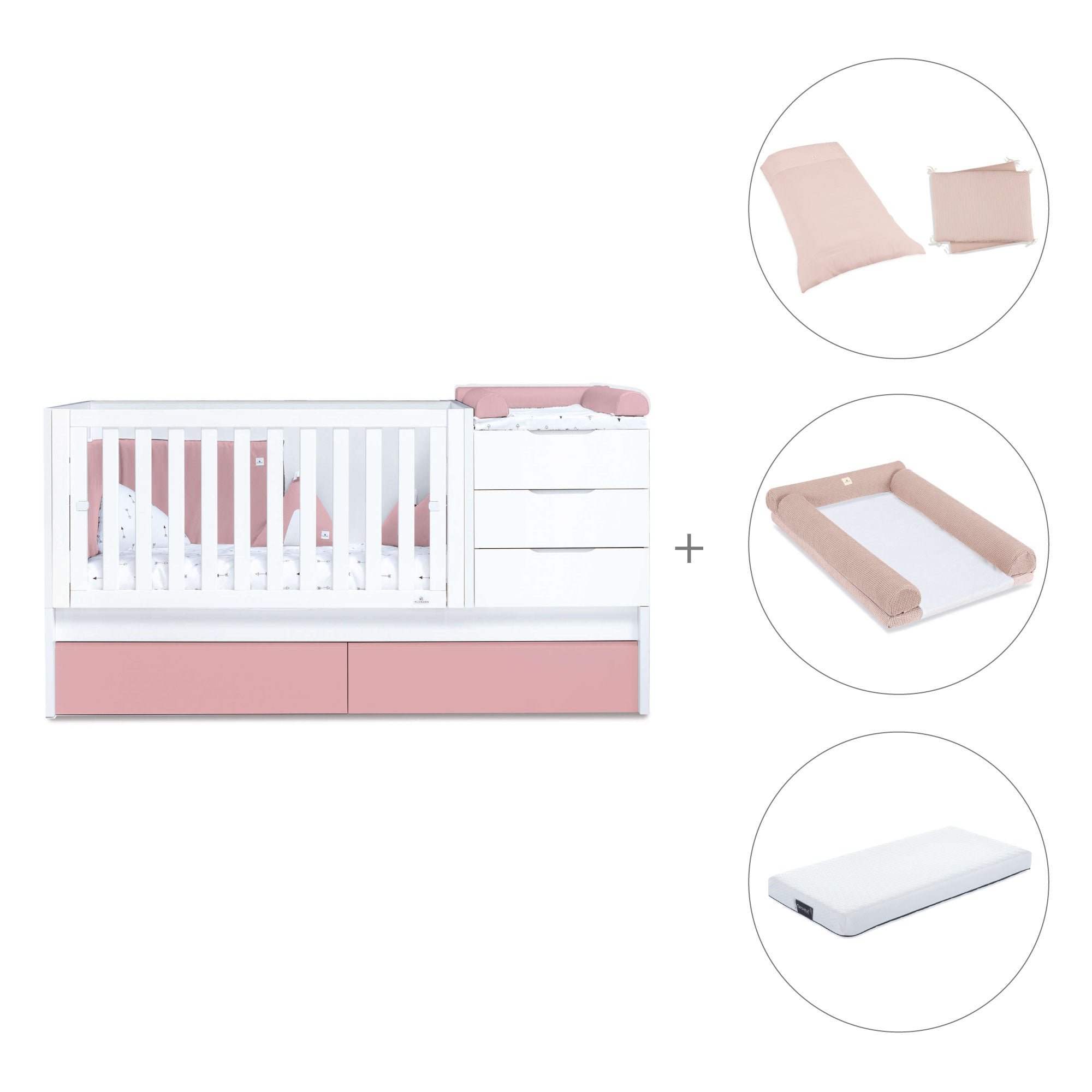 • Trasformabile in letto junior 90x200 cm (con cassetti o letto estraibile), un comodino con 3 cassetti, scrivania e book libreria (non sono necessari elementi aggiuntivi).